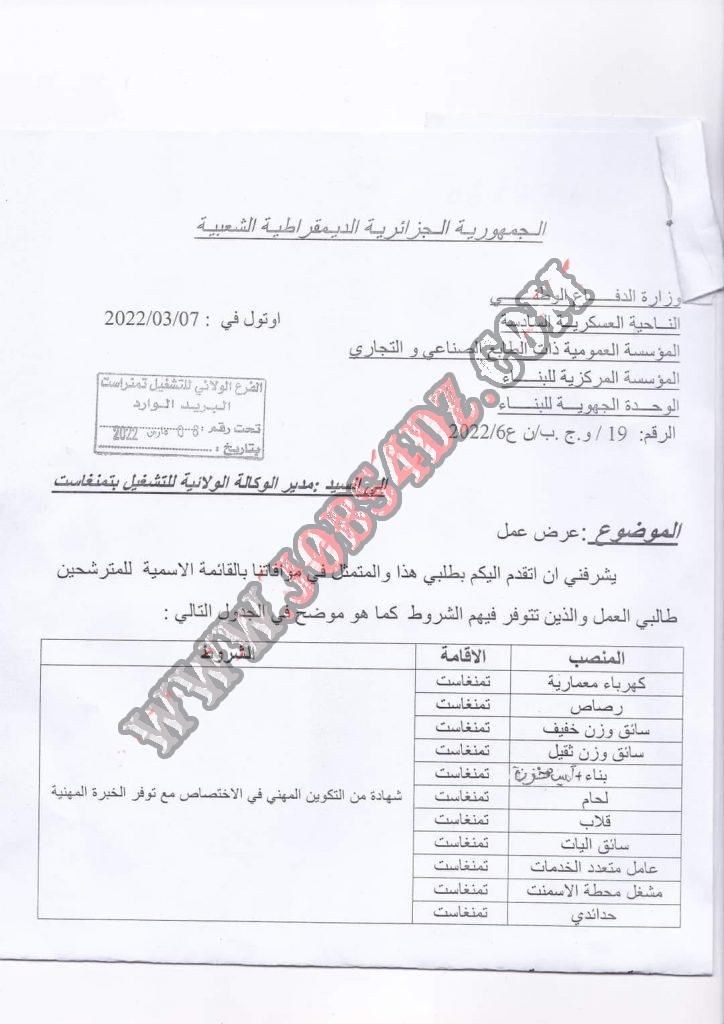 المؤسسة المركزية للبناء بالناحية العسكرية السادسة بولاية تمنراست عن حاجتها الى عمال في المناصب التالية
