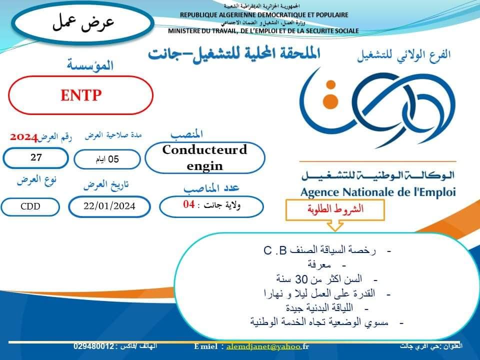 اعلان توظيف بالمؤسسة الوطنية للأشغال في الآبار ENTP (81 منصب) شاركها Facebook Twitter LinkedIn Pinterest الفرع الولائي للتشغيل جانت الملحقة المحلية للتشغيل