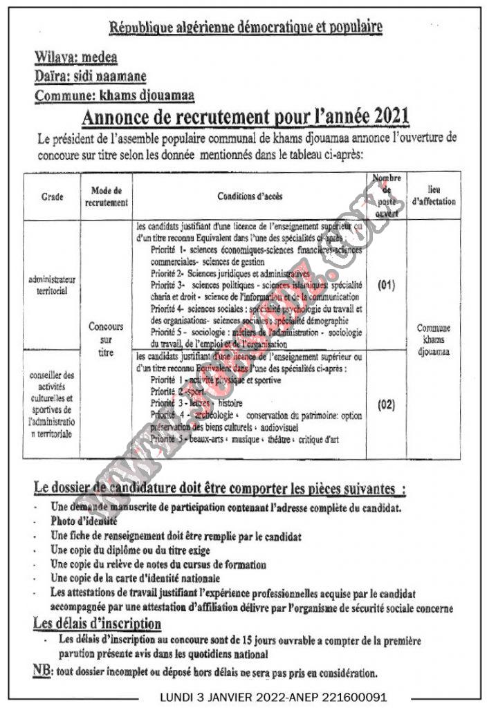يعلن رئيس المجلس الشعبي البلدي خمس جوامع ولاية المدية عن فتح مسابقة على اساس الشهادة في مناصب الشغل المبينة ادناه