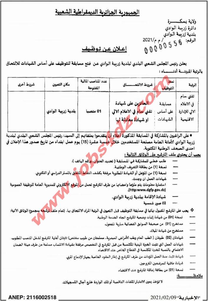 يعلن رئيس المجلس الشعبي البلدي لبلدية زريبة الوادي عن فتح مسابقة للتوظيف على اساس الشهادات للالتحاق بالرتبة المبينة ادناه