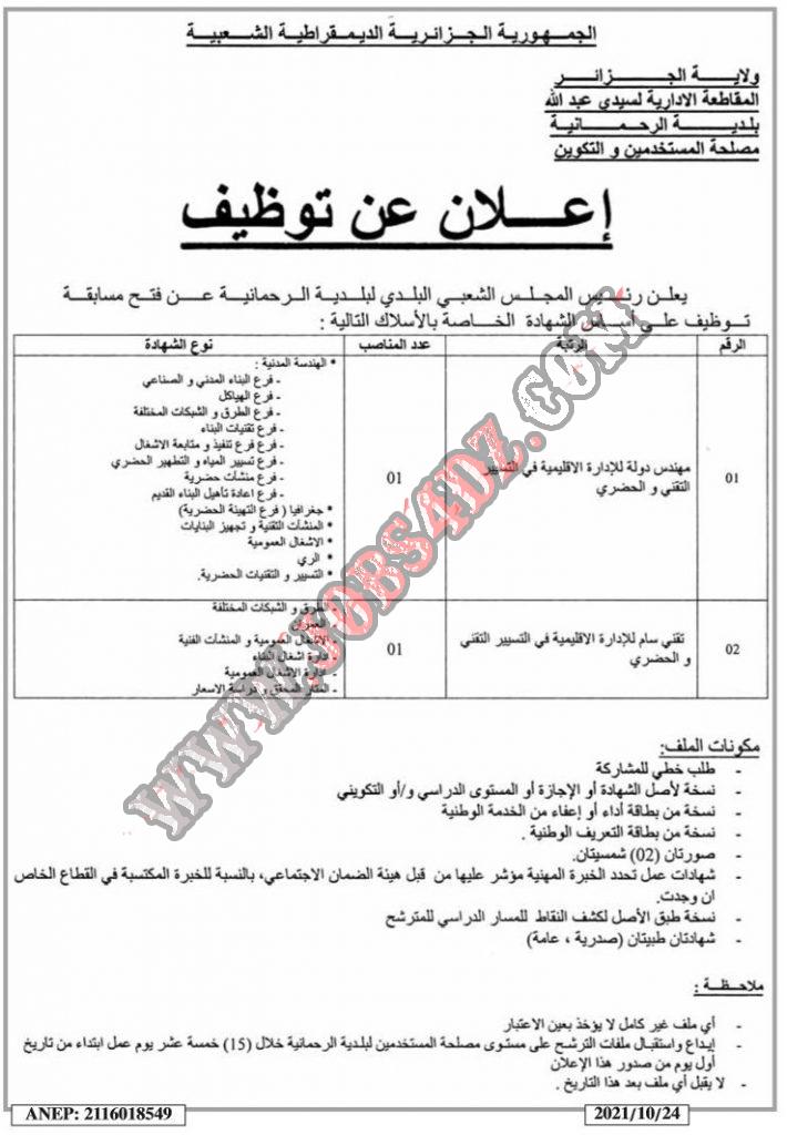 يعلن رئيسلمجلس الشعبي البلدي لبلدية الرحمانية عن فتح عملية توظيف على اساس الشهادة في الرتب المبينة ادناه