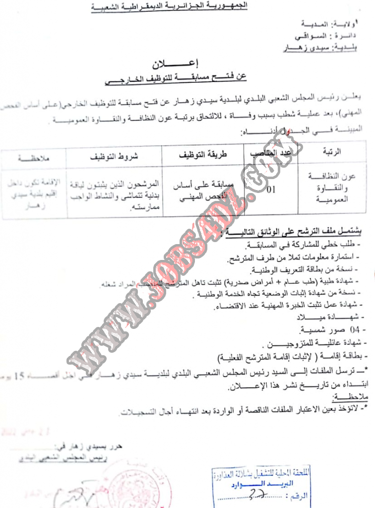 يعلن رئيس المجلس الشعبي البلدي لبلدية سيدي زهار عن فتح مسابقة للتوظيف الخارجي على اساس الفحص المهني للالتحاق بالرتبة التالية