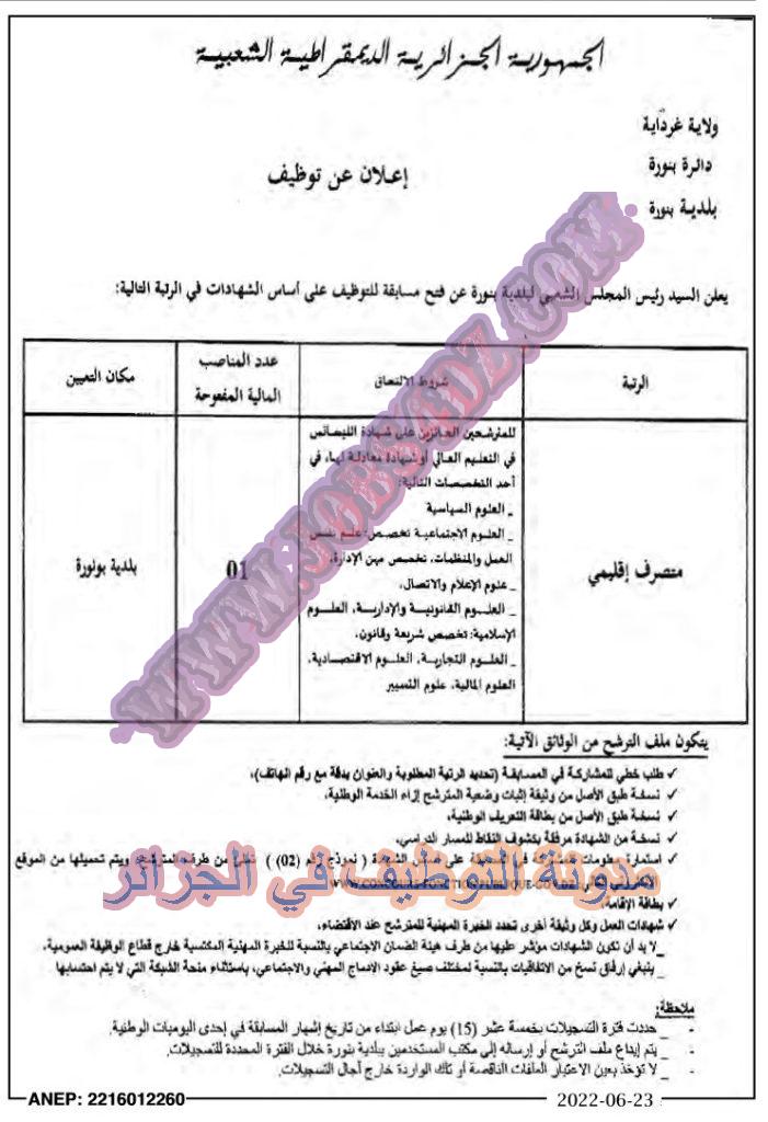يعلن رئيس المجلس الشعبي البلدي لبلدية بنورة عن فتح مسابقة توظيف على اساس الشهادة بعنوان السنة المالية 2022 في المناصب المبينة ادناه