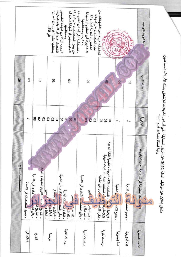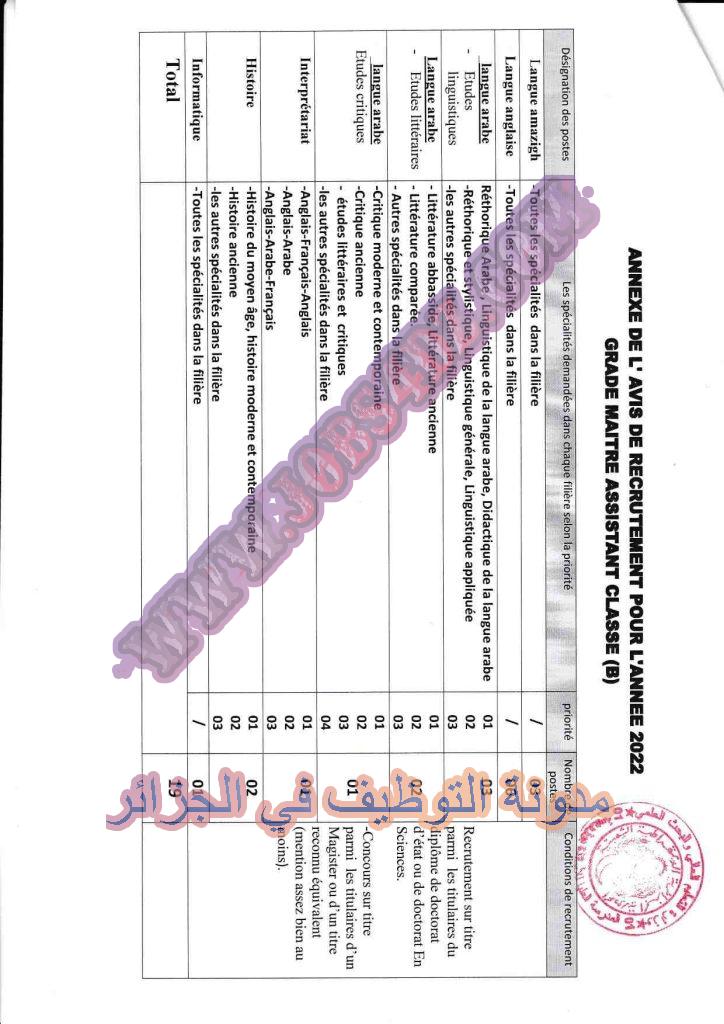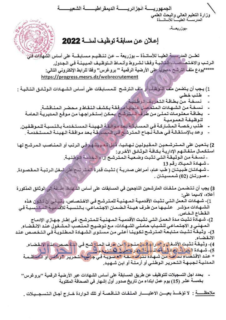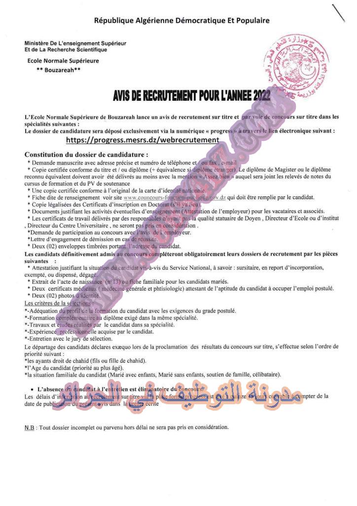 تعلن المدرسة العليا للأساتذة بوزريعة بالجزائر العاصمة عن فتح مسابقة توظيف على اساس الشهادة بعنوان السنة المالية 2022 في المناصب المبينة ادناه
