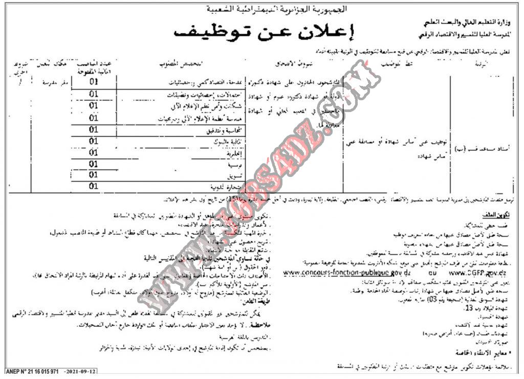 تعلن المدرسة العليا للتسيير والاقتصاد الرقمي عن فتح مسابقة للتوظيف على اساس الشهادة للسنة المالية 2021 في الرتب التالية