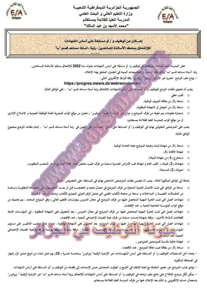 تعلن المدرسة العليا للفلاحة بولاية مستغانم عن فتح مسابقة توظيف على اساس الشهادة بعنوان السنة المالية 2022 في المناصب المبينة ادناه