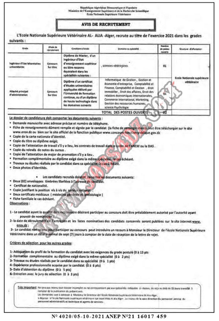 تعلن المدرسة الوطنية العليا للبيطرة عن فتح توظيف على اساس الشهادة لسنة المالية 2021 في المناصب التالية