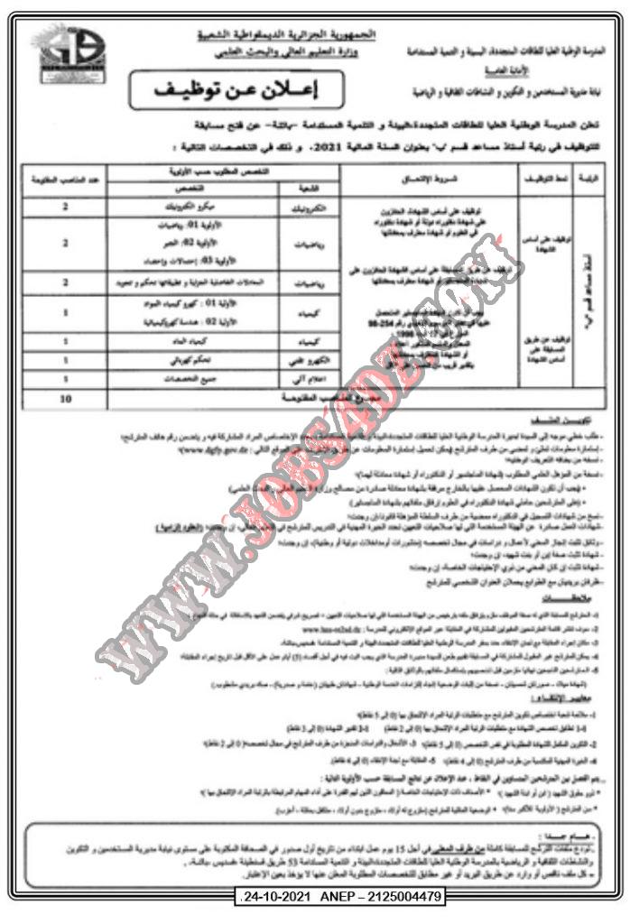 تعلن المدرسة الوطنية العليا للطاقات المتجددة والبيئة والتنمية المستدامةعن فتح مسابقة للتوظيف الخارجي بعنوان سنة 2021 ، للالتحاق بمنصب أستاذ مساعد قسم ”ب* كما هو موضح ادناه