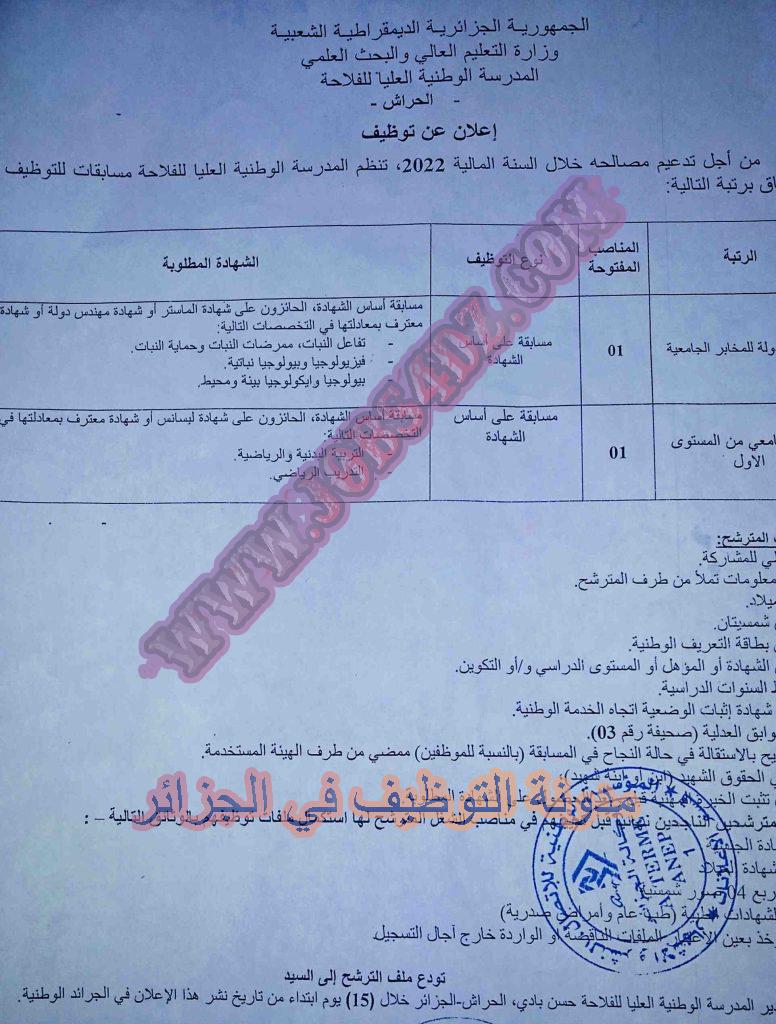 تعلن المدرسة الوطنية العليا للفلاحة الحراش الجزائر العاصمة عن فتح مسابقة توظيف على اساس الشهادة بعنوان السنة المالية 2022 في المناصب المبينة ادناه