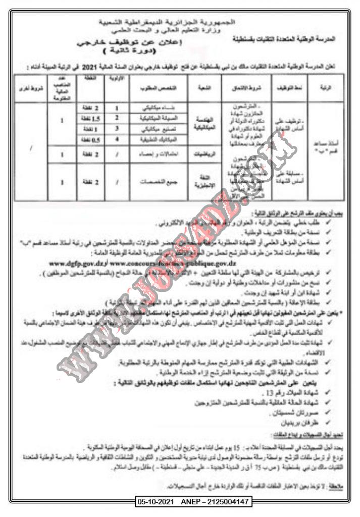 تعلن المدرسة الوطنية المتعددة التقنيات مالك بن نبي بقسنطينة عن فتح توظيف خارجي بعنوان السنة المالية 2021 في الرتبة المبينة ادناه
