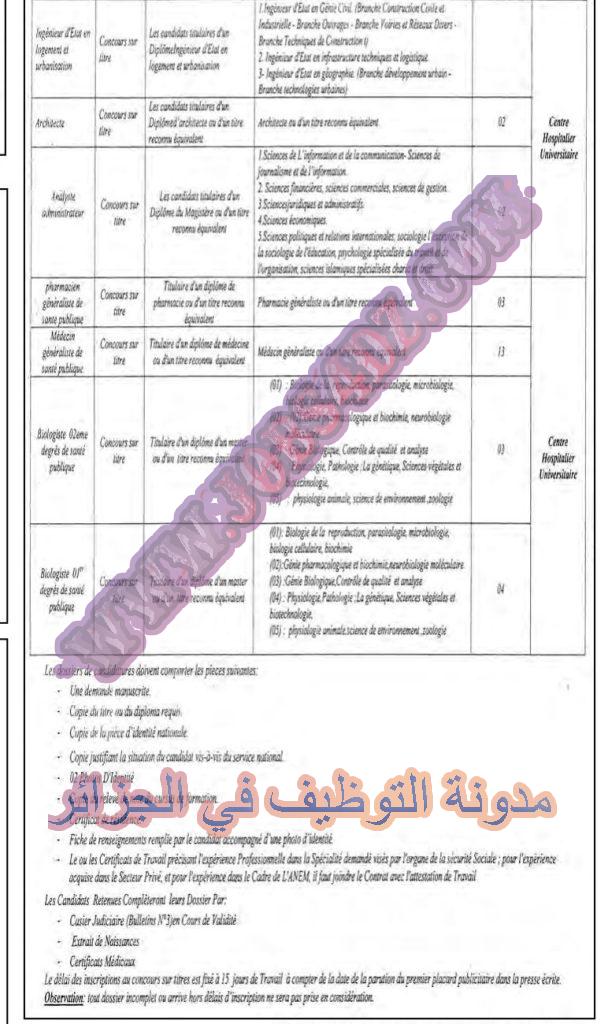 تعلن المركز الإستشفائي الجامعي جيلالي بونعامة دويرة عن فتح مسابقة توظيف على اساس الشهادة في الرتب المبينة ادناه