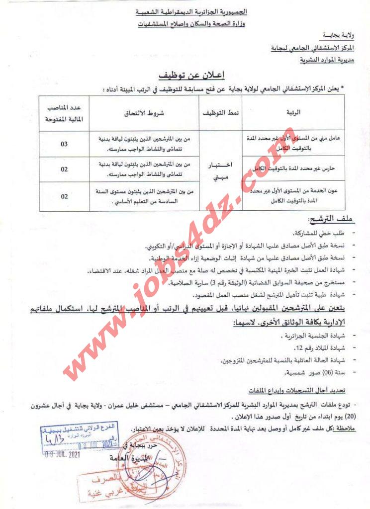 يعلن المركز الاستشفائي الجامعي لولاية بجاية عن فتح مسابقة للتوظيف في الرتب المبينة ادناه