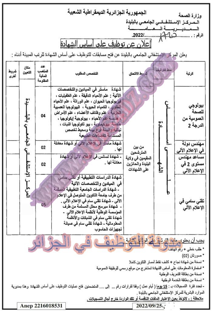 تعلن المركز الاستشفائي الجامعي البليدة عن فتح مسابقة توظيف على اساس الشهادة في الرتب المبينة ادناه