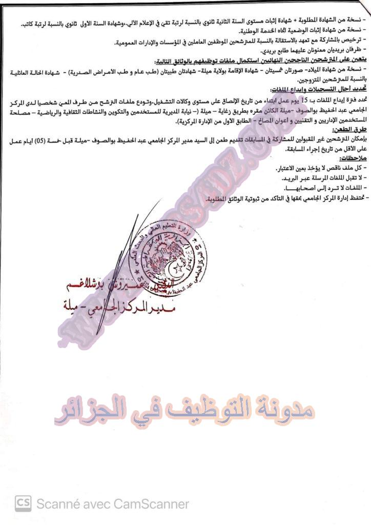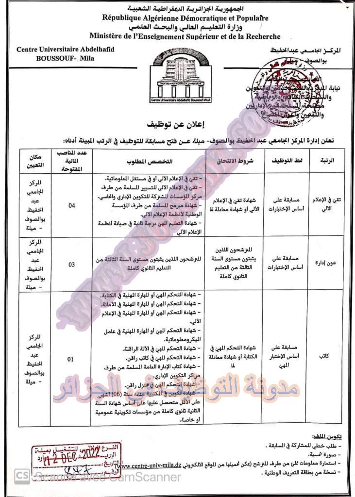 تعلن إدارة المركز الجامعي عبد الحفيظ بوالصوف بولاية ميلة عن فتح مسابقة توظيف على اساس الاختبارات في الرتب المبينة ادناه
