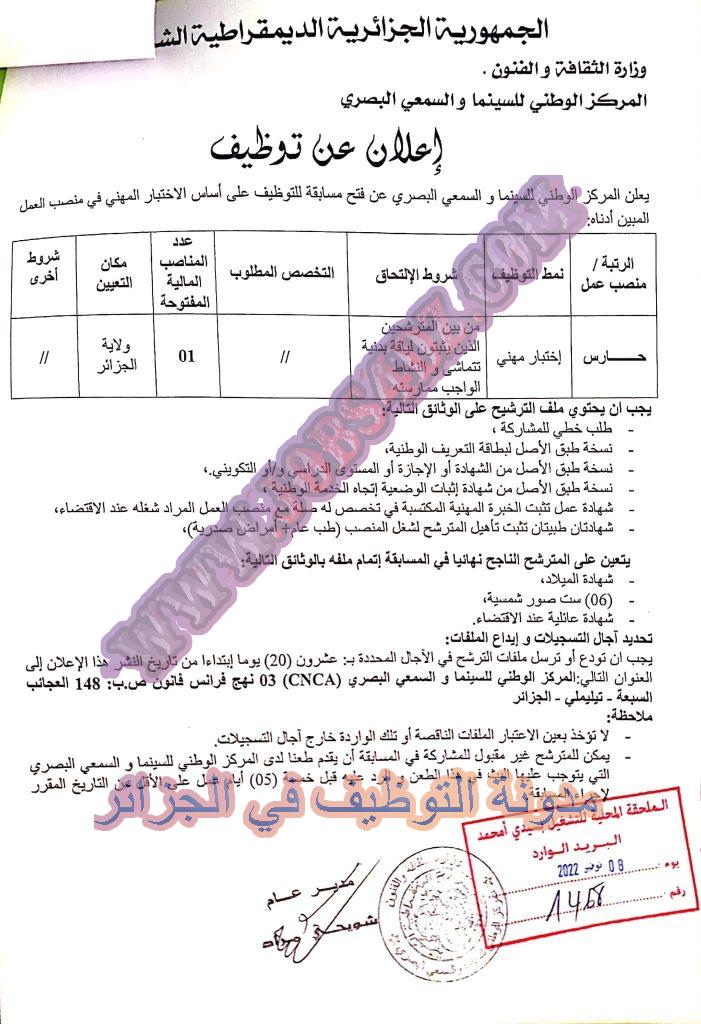 يعلن المركز الوطني للسينما و السمعي البصري بالجزائر العاصمة عن فتح مسابقات توظيف على اساس الاختبار المهني وعلى اساس الشهادة في الرتب المبينة ادناه