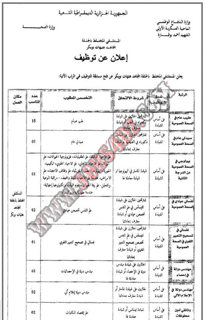 يعلن المستشفى المختلط بالجلفة عن فتح مسابقة التوظيف في الرتب التالية