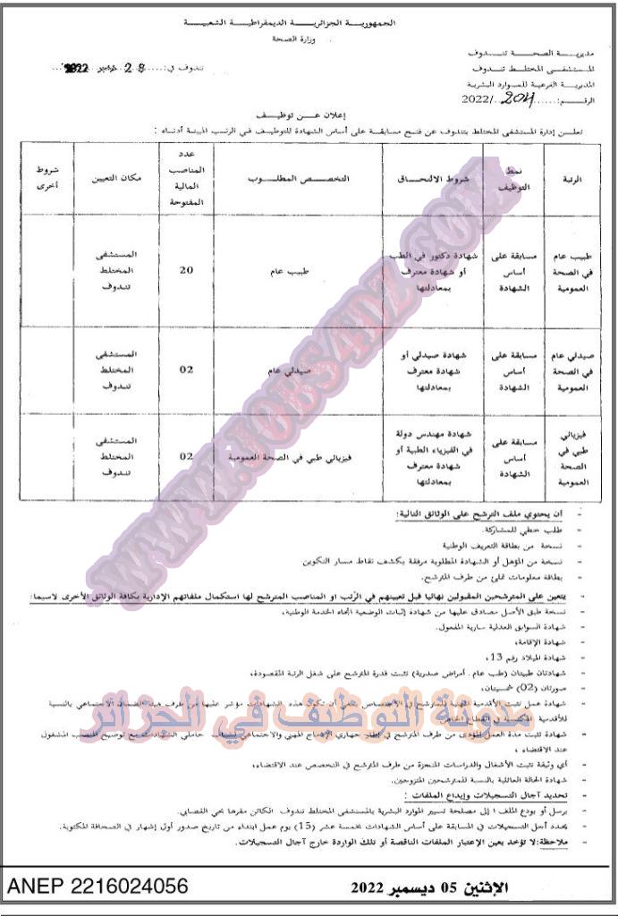 يعلن المستشفى المختلط تندوف عن فتح مسابقة توظيف على اساس الشهادة في الرتب المبينة ادناه