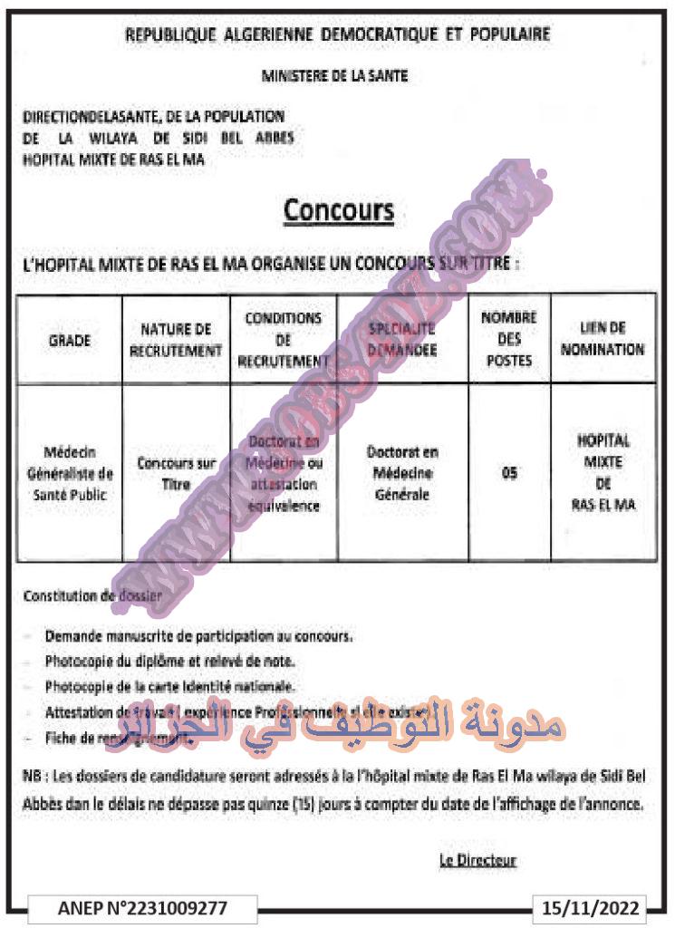 يعلن المستشفى المختلط راس الماء سيدي بلعباس عن فتح مسابقات توظيف على اساس الشهادة في الرتب المبينة ادناه