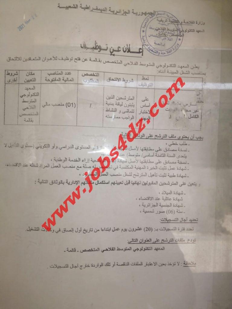 يعلن المعهد التكنولوجي المتوسط الفلاحي المتخصص قالمة عن فتح توظيف في الترب التالية