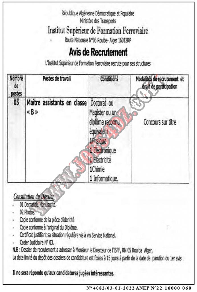 يعلن المعهد العالي للتكوين في السكك الحديدية الرويبة الجزائر العاصمة عن فتح مسابقات توظيف على اساس الشهادات للالتخاق بالرتب التالية