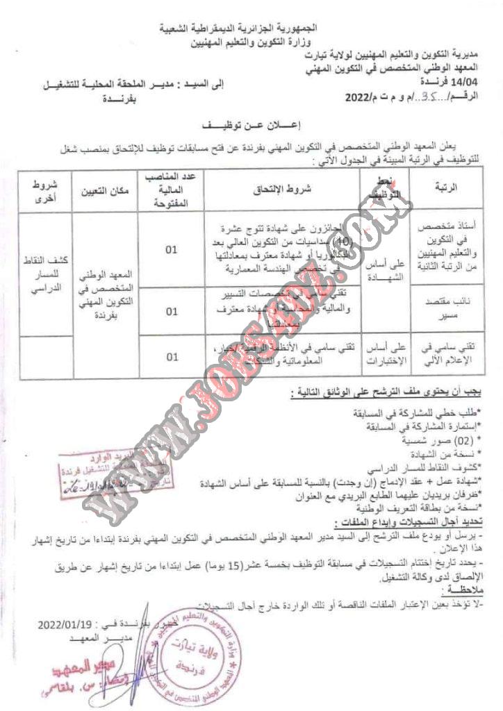يعلن المعهد الوطني المتخصص في التكوين المهني فرندة ولاية تيارت عن فتح مسابقة توظيف في الرتبة المبينة ادناه