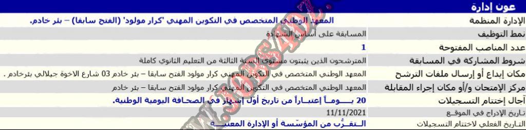 يعلن المعهد الوطني المتخصص في التكوين المهني ‘كرار مولود’ (الفتح سابقا) – بئر خادم عن فتح مسابقة توظيف على اساس الشهادة في المنصب المدون ادناه