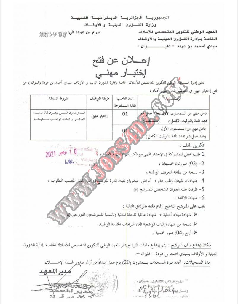 يعلن المعهد الوطني المتخصص للأسلاك وادارة الشؤون الدينية لولاية غليزان عن فتح مسابقة توظيف في الرتب المبينة ادناه