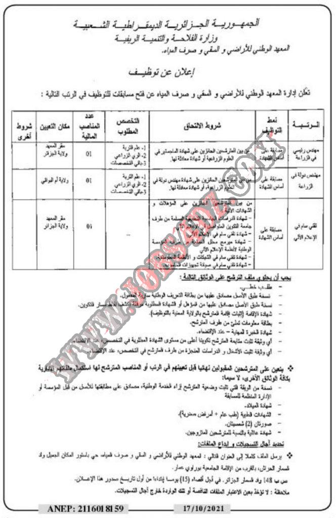 تعلن ادارة المعهد الوطني للاراضي والسقي وصرف المياه عن فتح مسابقات للتوظيف في التب التالية