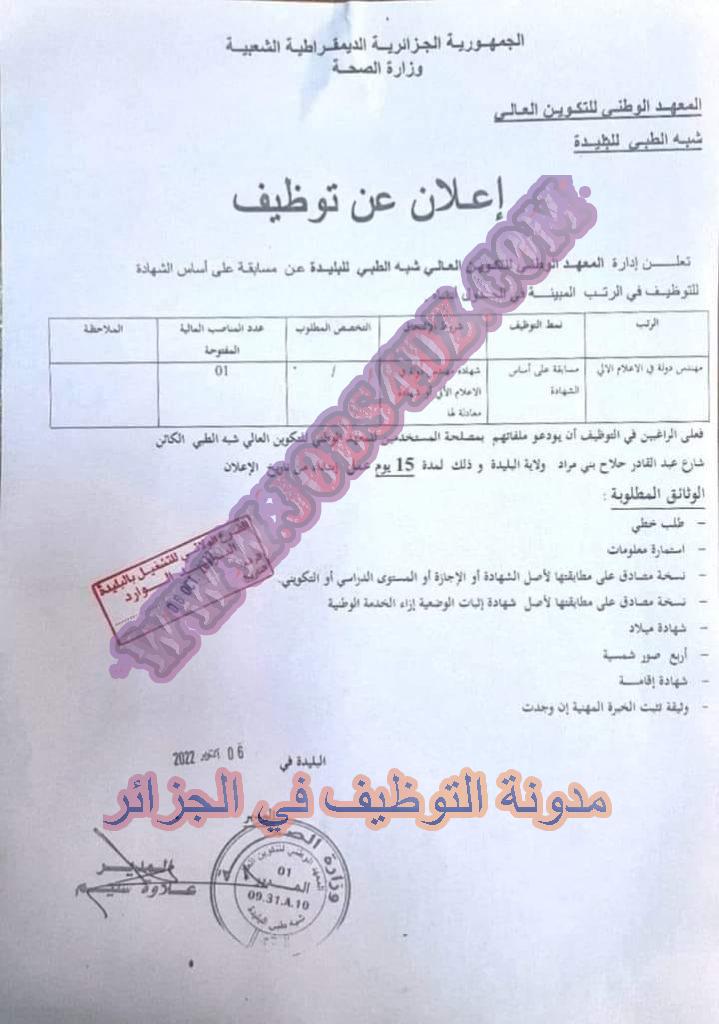 تعلن المعهد الوطني للتكوين العالي شبه الطبي البليدة عن فتح مسابقة توظيف على اساس الشهادة في الرتب المبينة ادناه