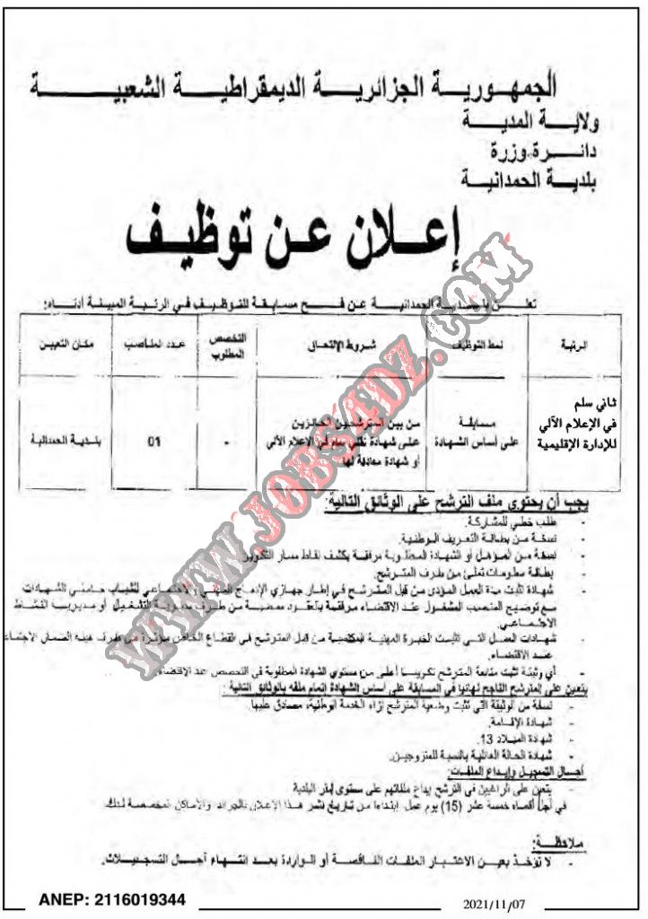 تعلن بلدية الحمدانية عن غتح مسابقة للتوظيف قي الرتب المبينة ادتاه