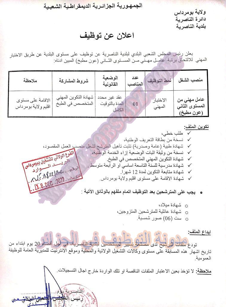 يعلن رئيس المجلس الشعبي البلدي لبلدية الناصرية عن فتح مسابقة توظيف على اساس الاختبار المهني في الرتب المبينة ادناه