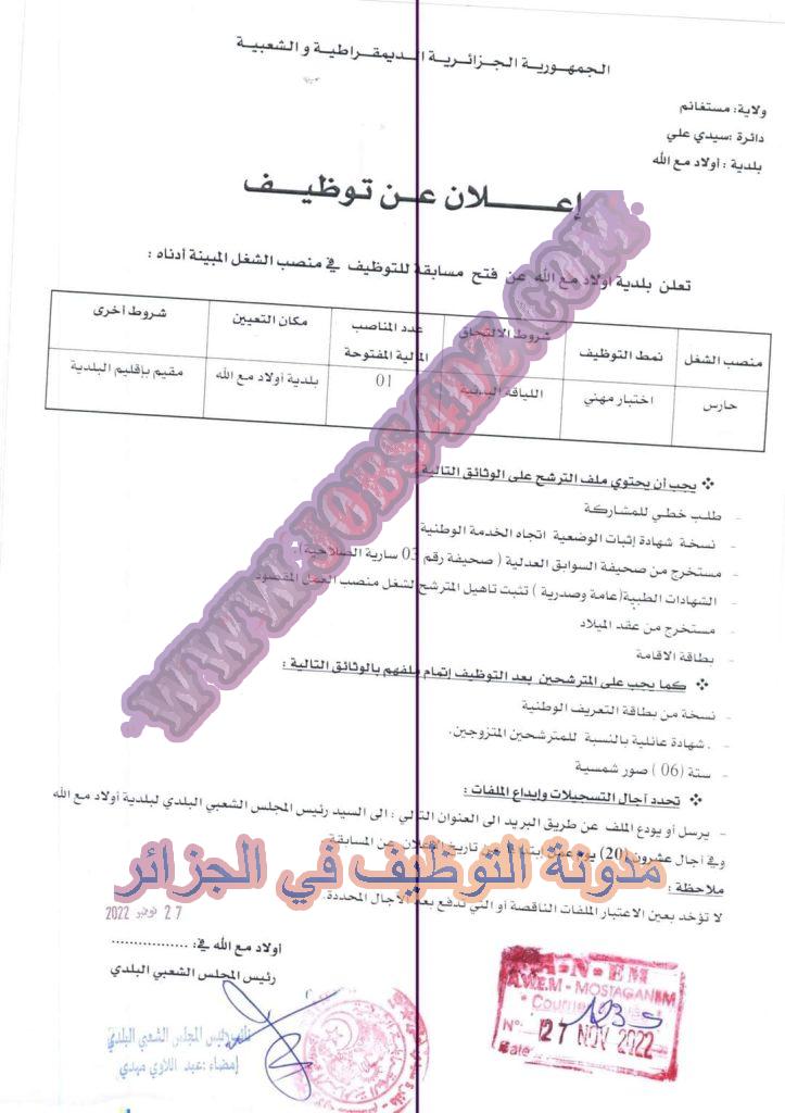يعلن بلدية اولاد مع الله لولاية مستغانم عن فتح مسابقة توظيف على اساس الاختبار المهني في الرتب المبينة ادناه