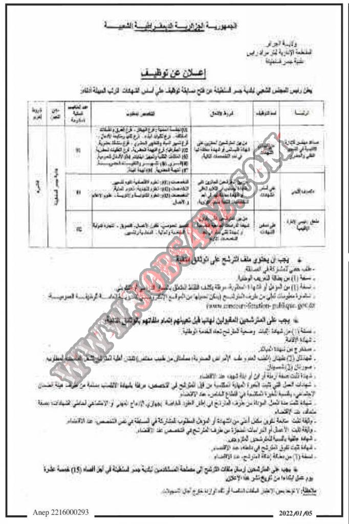 يعلن رئيس المجلس الشعبي لبلدية جسر قسنطينة بالجزائر العاصمة عن فتح مسابقة للتوظيف في الرتب التالية