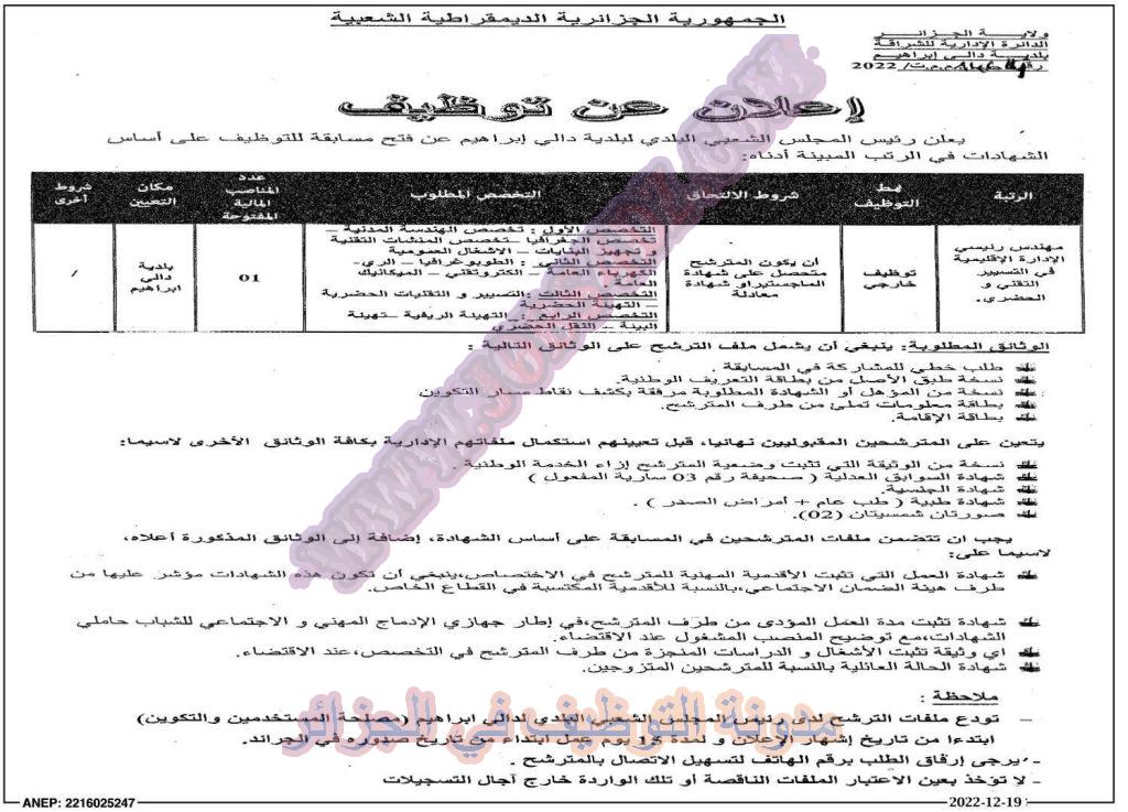 اعلان توظيف ببلدية دالي ابراهيم الجزائر العاصمة