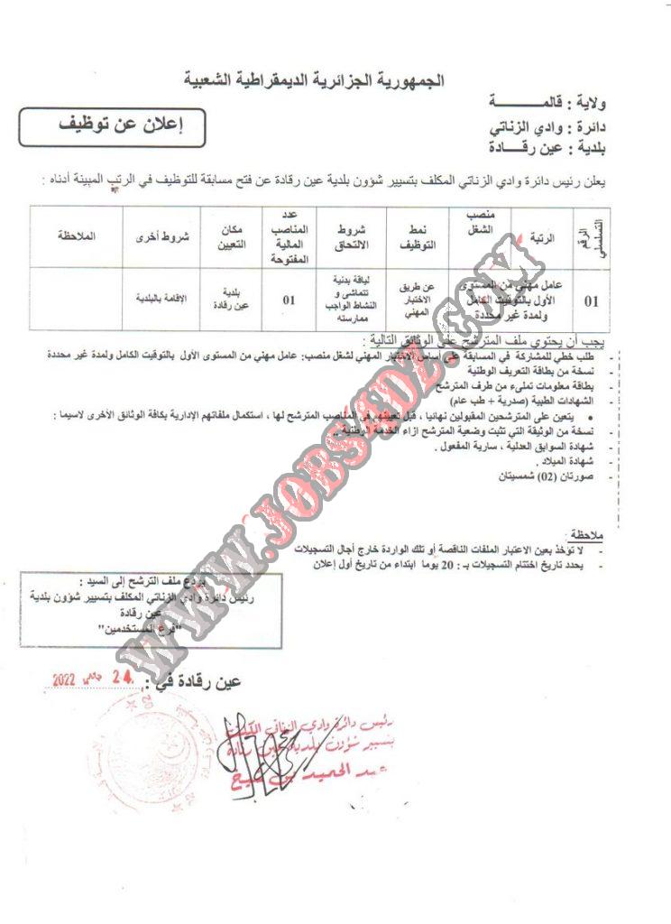يعلن رئيس دائرة وادي الزناتي المكلف بتسيير شؤون بلدية عين رقادة عن فتح مسابقة توظيف في الرتبة المبينة ادناه