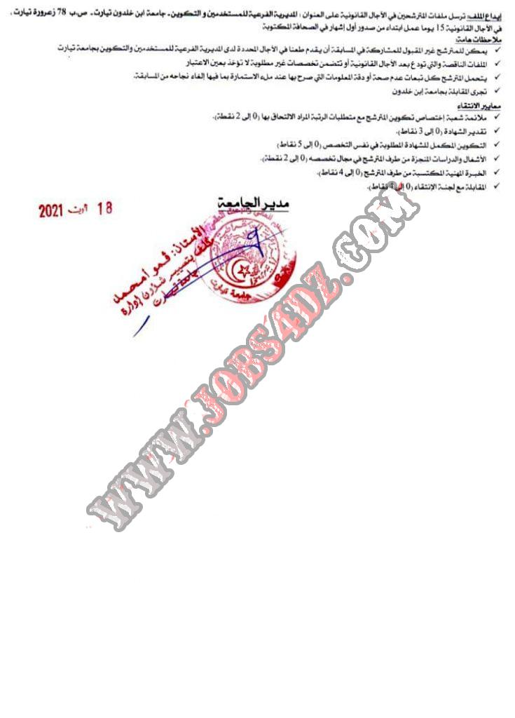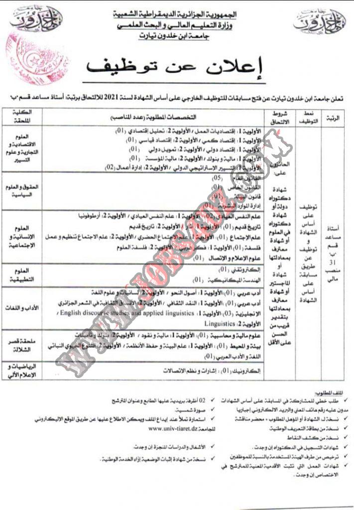 تعلن جامعة ابن خلدون تيارت عن فتح مسابقة للتوظيف الخارجي على اساس الشهادة للسنة المالية 2021 للالتحاق بالرتب التالية