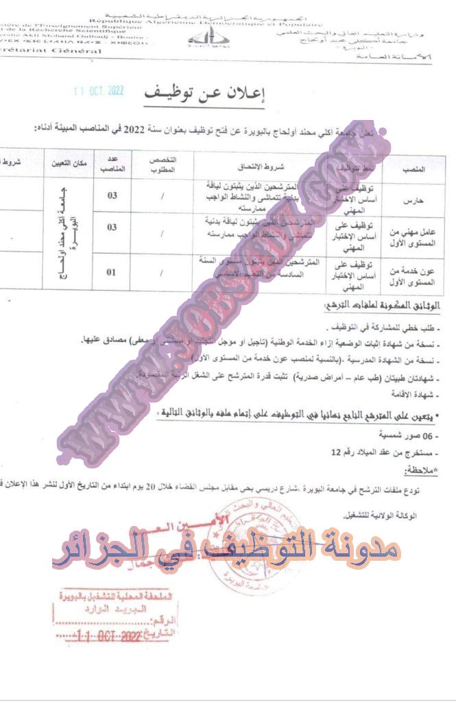 تعلن جامعة اكلي محند اولحاج البويرة عن فتح مسابقة توظيف على اساس الاختبار المهني في الرتب المبينة ادناه