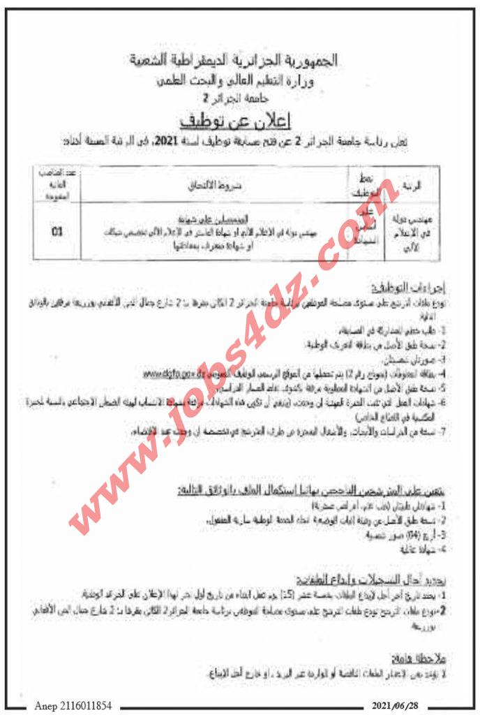 تعلن رئاسة جامعة الجزائر 2 عن فتح مسابقة توظيف لسنة 2021 في الرتب المبينة ادناه