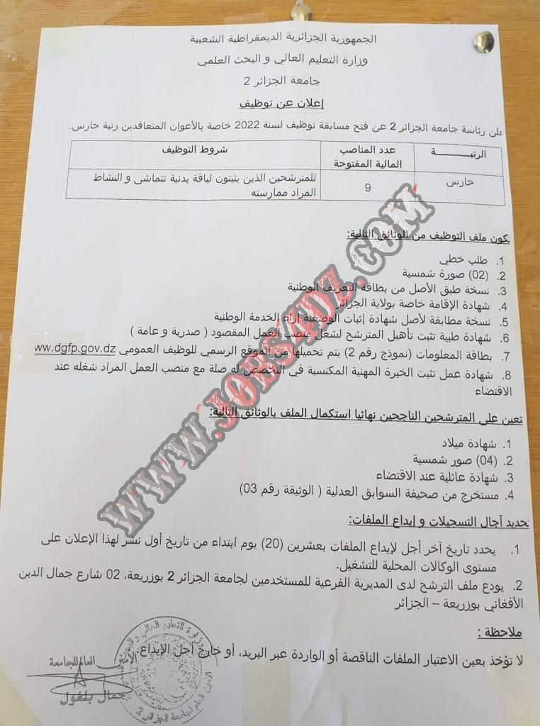 تعلن رئاسة جامعة الجزائر 2 عن فتح مسابقة توظيف اسنة 2022 خاصة بالأعوان المتعاقدين رتبة