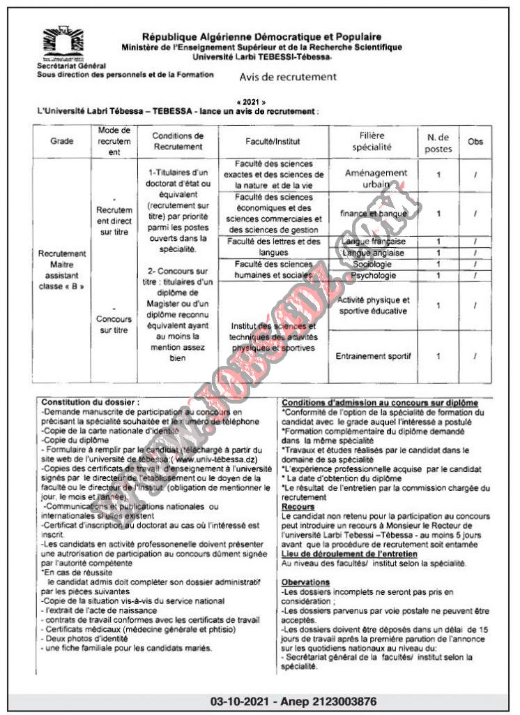 تعلن جامعة العربي تبسي بولاية تبسة عن فتح مسابقات توظيف على اساس الشهادات للالتخاق بالرتب التالية