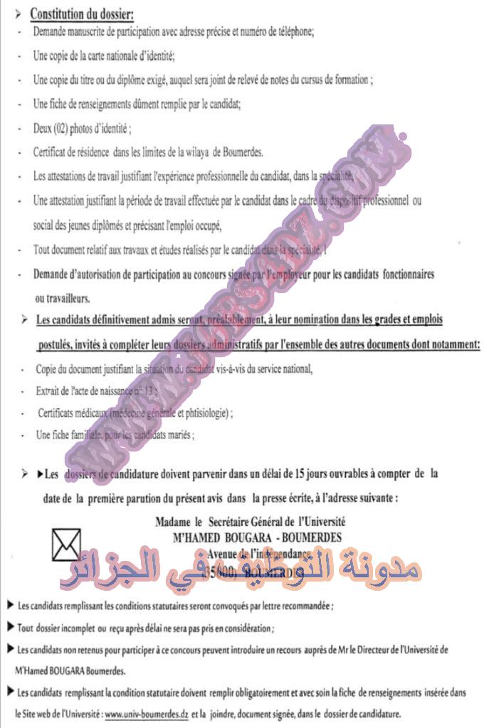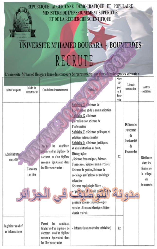 تعلن جامعة امحمد بوقرة ولاية بومرداس عن فتح مسابقة توظيف على اساس الشهادة بعنوان السنة المالية 2022 في المناصب المبينة ادناه