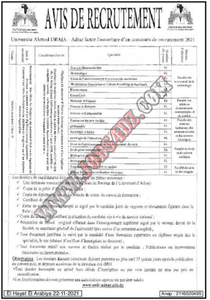تعلن جامعة جامعة أحمد دراية أدرار عن فتح مسابقة توظيف مناصب استاذ مساعد قسم ب على اساس الشهادة للسنة المالية 2021 في التخصصات الموضحة في الصورة ادناه