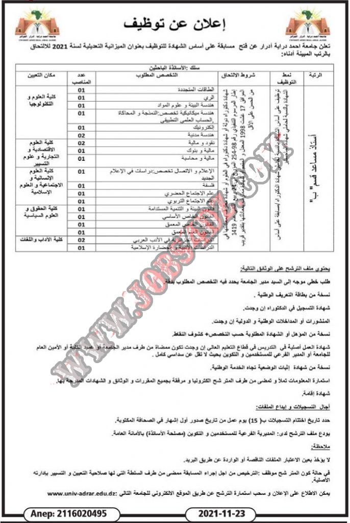 تعلن جامعة جامعة أحمد دراية أدرار عن فتح مسابقة توظيف في منصب الاساتذة المساعدين قسم ب على اساس الشهادة للسنة المالية 2021 في التخصصات الموضحة في الصورة ادناه
