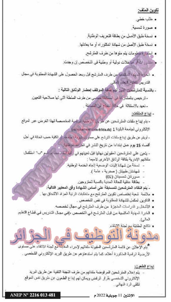 تعلن جامعة سعد دحلب البليدة 1 تعلن عن فتح مسابقة توظيف على اساس الشهادة بعنوان السنة المالية 2022 في المناصب المبينة ادناه