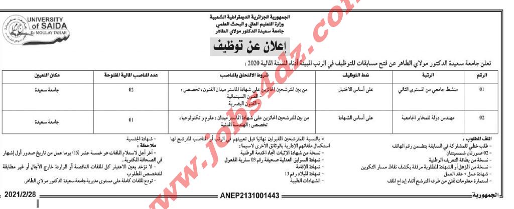 تعلن جامعة سعيدة الدكتور مولاي الطاهر عن فتح مسابقات للتوظيف في الرتبة المبينة أدناه :