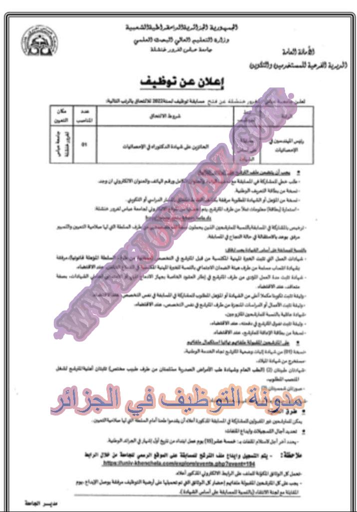 تعلن جامعة عباس لغرور خنشلة عن فتح مسابقة توظيف على اساس الشهادة بعنوان السنة المالية 2022 في المناصب المبينة ادناه