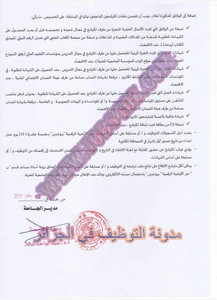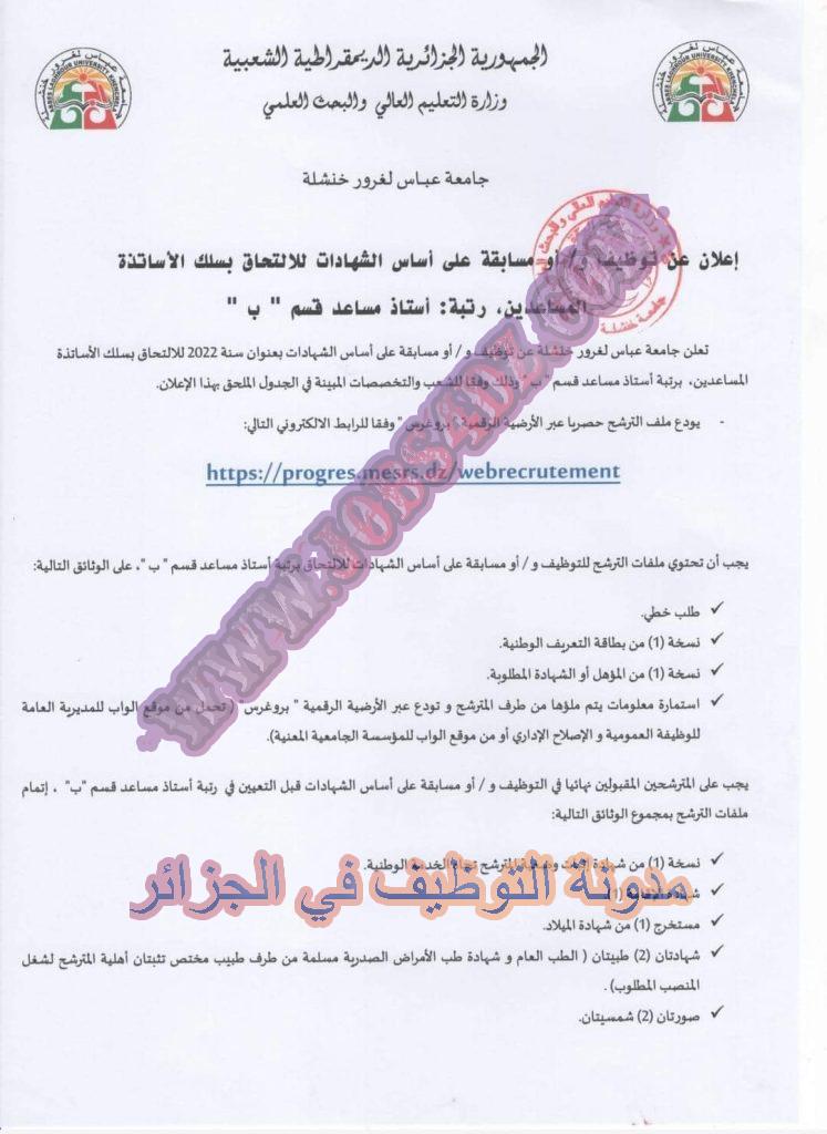 تعلن جامعة عباس لغرور خنشلة عن فتح مسابقة توظيف على اساس الشهادة بعنوان السنة المالية 2022 في المناصب المبينة ادناه