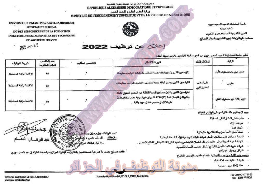 تعلن جامعة عبدالحميد مهري قسنطينة 02 عن فتح مسابقة توظيف على اساس الشهادة في الرتب المبينة ادناه