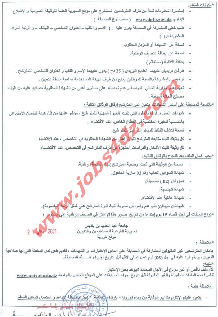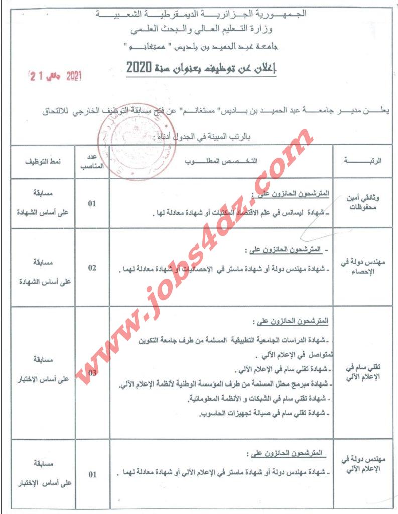 يعلن مدير جامعة عبد الحميد بن باديس مستغانم عن فتح مسابقة للتوظيف الخارجي للالتحاق بالرتب المبينة ادناه