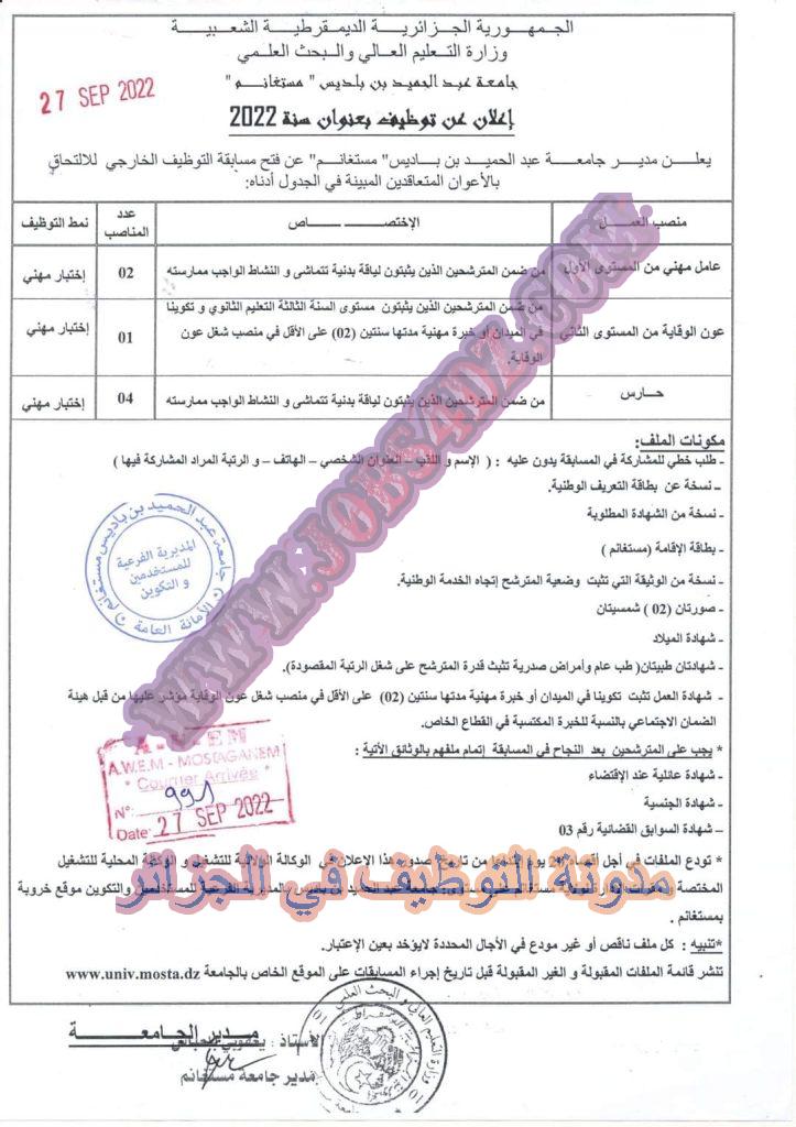 تعلن جامعة عبد الحميد بن باديس مستغانم عن فتح مسابقة توظيف على اساس الاختبار المهني في الرتب المبينة ادناه